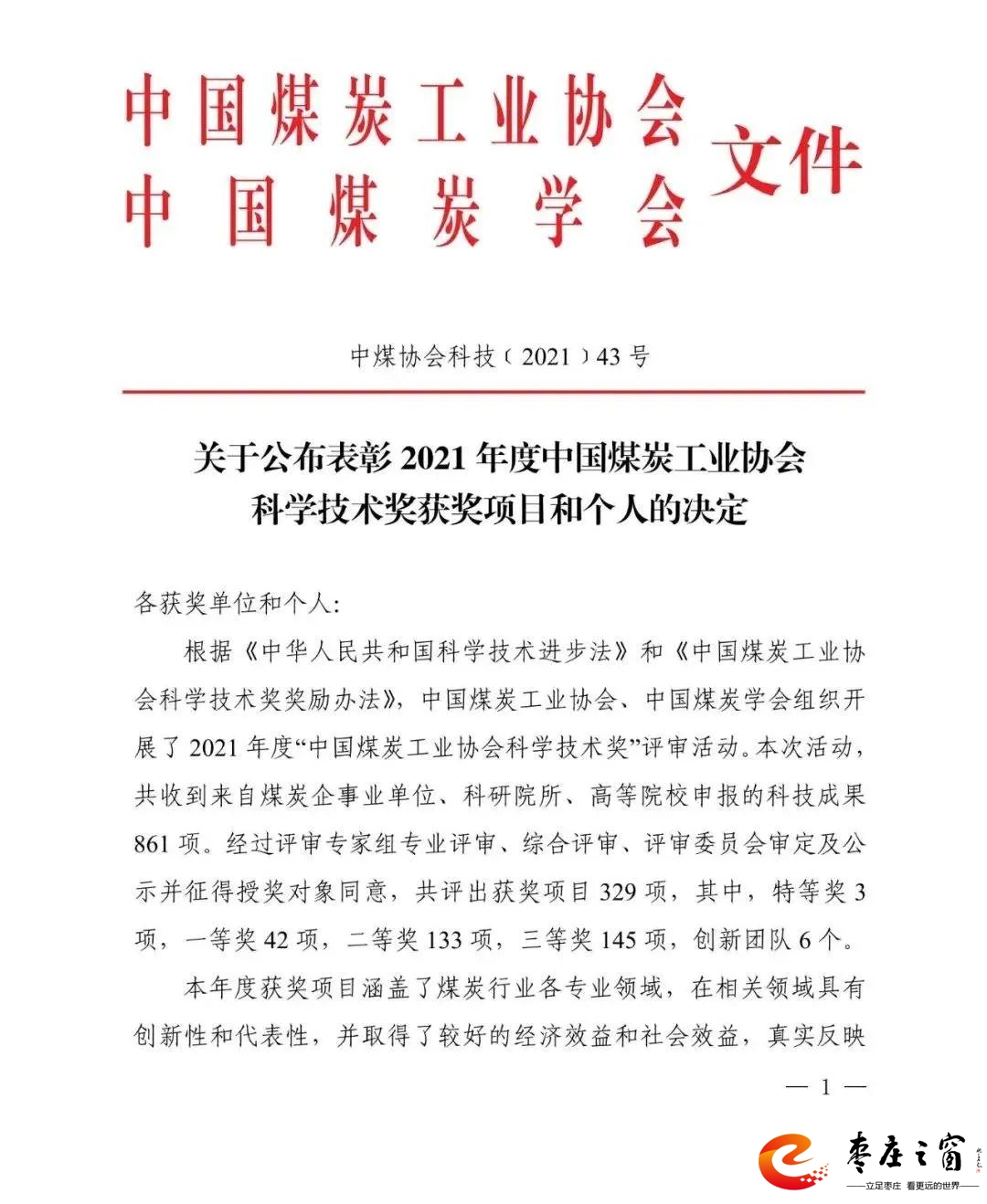 喜訊!田陳煤礦兩項(xiàng)科技成果榮獲2021年度中國(guó)煤炭工業(yè)協(xié)會(huì)科學(xué)技術(shù)獎(jiǎng)